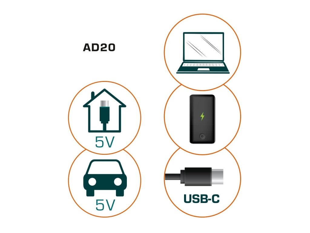 - AD14 - oranžová barva, zástrčka 12V (do auta) + adaptér pro připojení do zástrčky 230 V (domácí zástrčka)