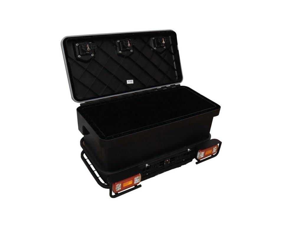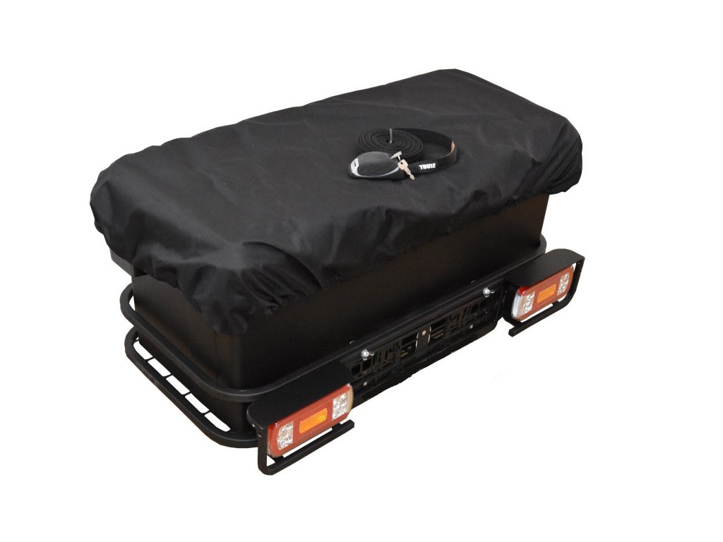 dále pak obsahuje 154l přepravní bednu / BOX / kufr na zavazadla, převlečník proti vlhkosti a uzamykatelný popruh s ocelovým lankem pro zabezpečení boxu na nosiči.