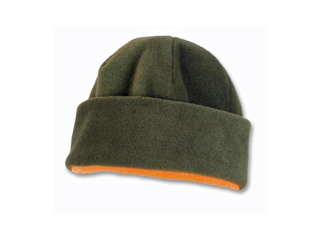 Fleecová zimní čepice, oboustranná. Je velmi oblíbená mezi myslivci a lidmi, kteří dbají na bezpečnost v přírodě. Jedna strana zelená (myslivecká), druhá strana výrazně oranžová