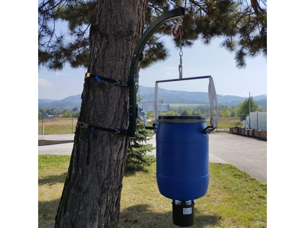 Kovová konstrukce s navijákem umožňuje snadné zavěšení barelu nebo jiné nádoby s automatickým krmítkem na kmen stromu a jeho vyzvednutí do požadované výšky.