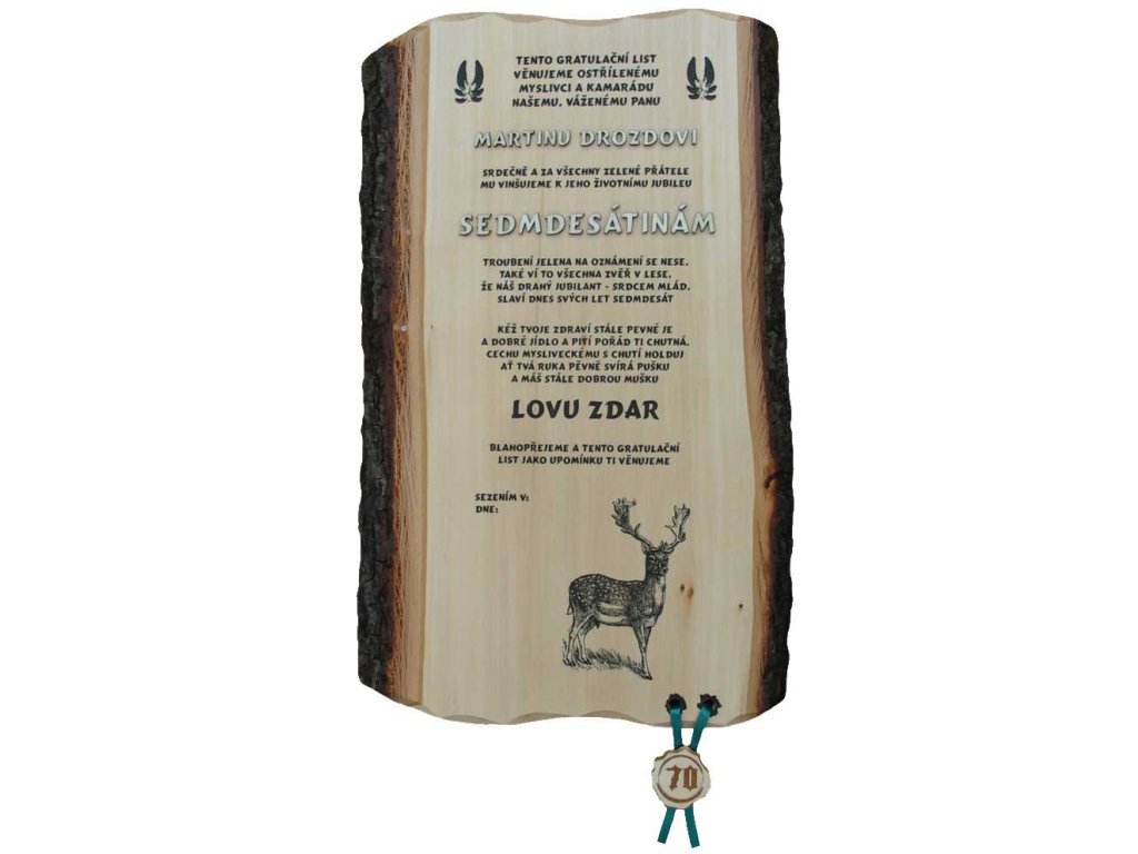 Gratulace myslivec č.727 na desce s kůrou 3D