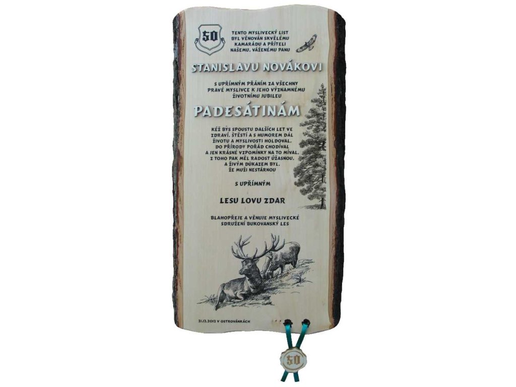 Gratulace myslivec č.743 na desce s kůrou 3D