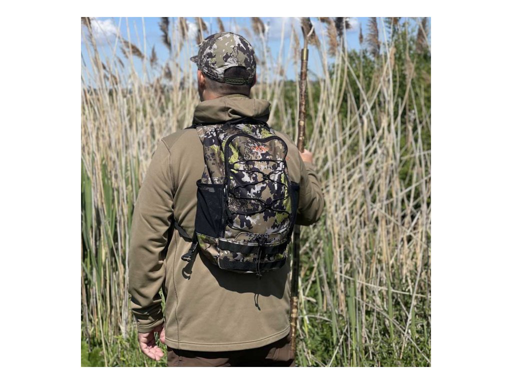Uvnitř se nachází přihrádka speciálně navržená pro hydratační vak (hydratační vak není součástí balení). Na vnější straně jsou elastické popruhy umožňující připevnit bundu a další předměty.