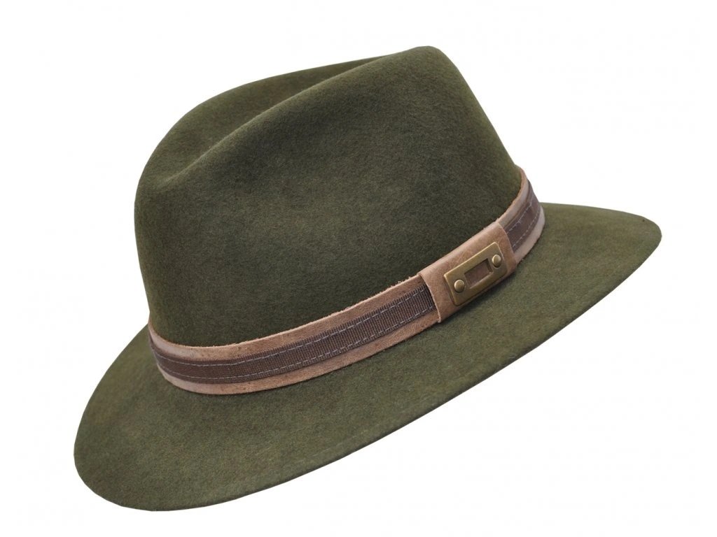 Myslivecký klobouk Adrian, 100% vlněná plsť, zdobený páskem v kombinaci kůže, textilní pásek a kovová ozdoba. Textilní potní pásek Werra Hunting.