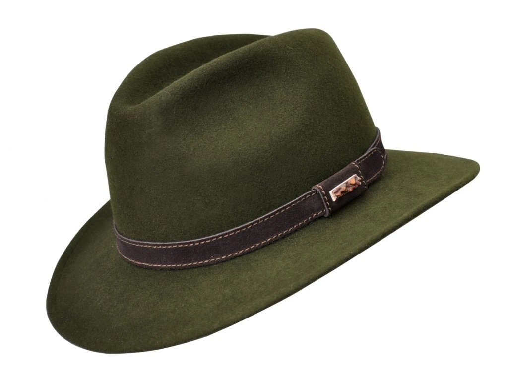 Myslivecký klobouk Arnold, 100% vlněná plsť, širší tvarovaná krempa, kožený pásek je zdobený aplikací z parohoviny. Textilní potní pásek Werra Hunting.