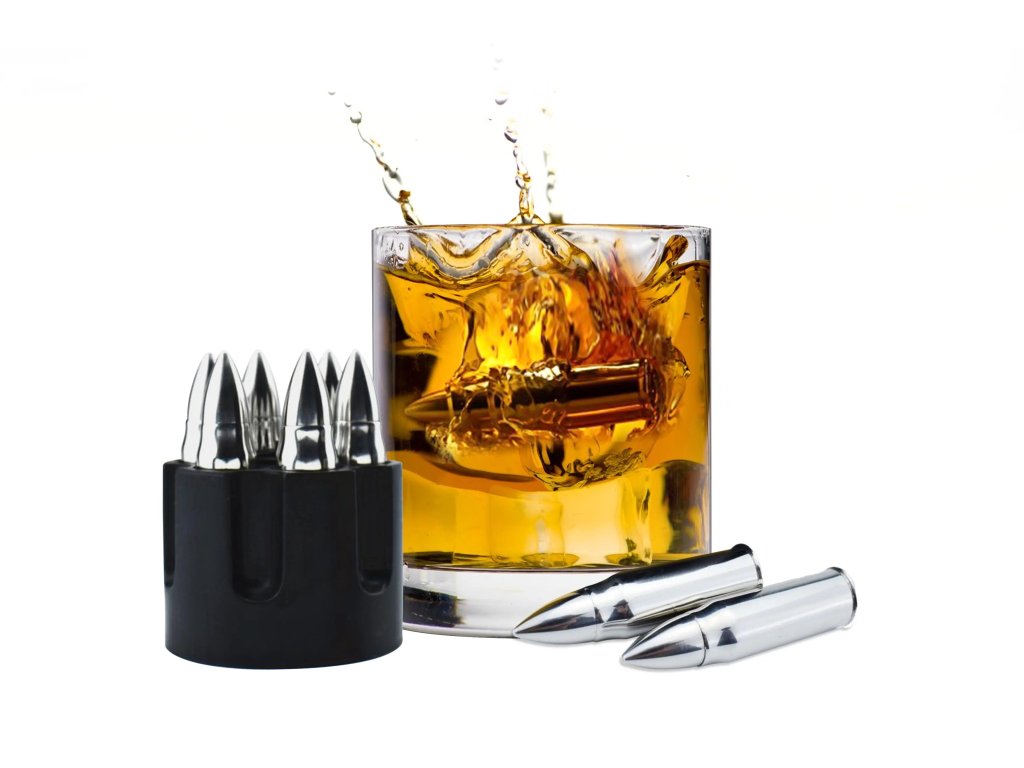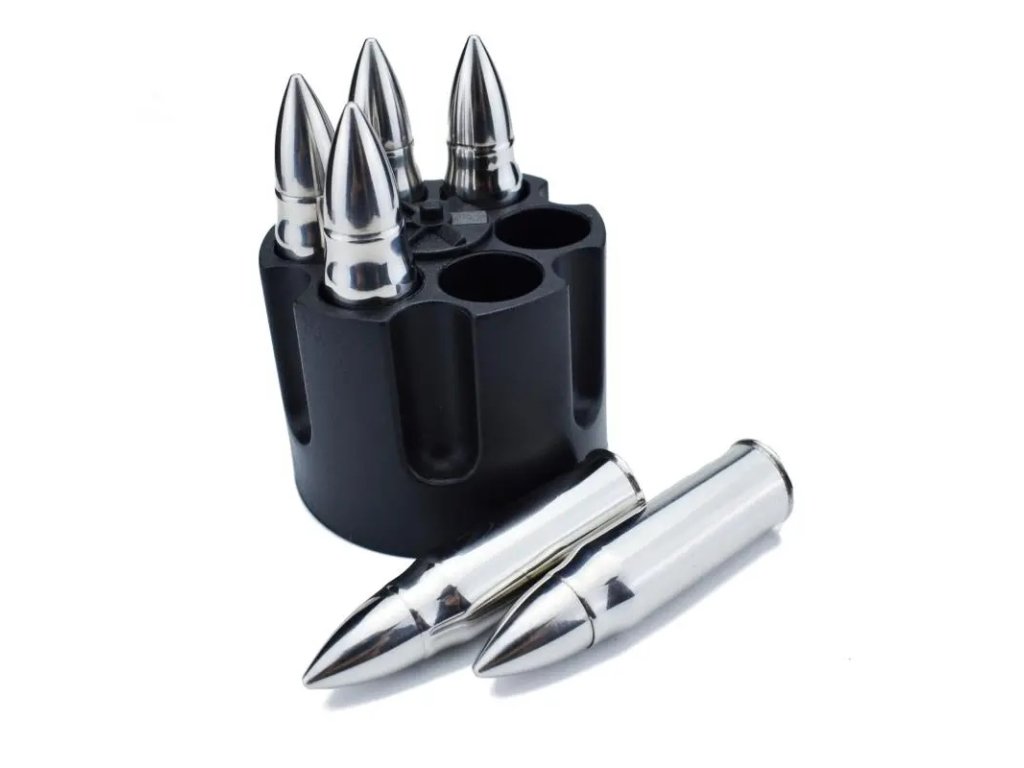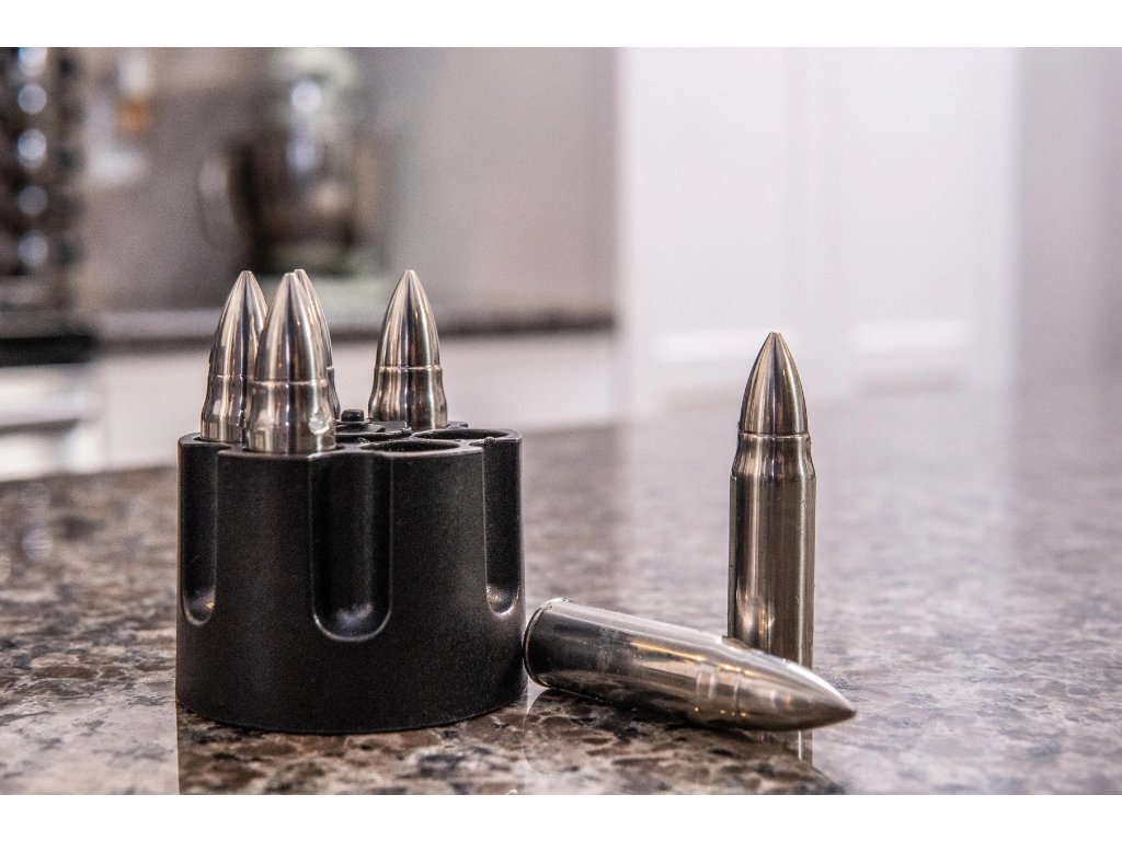 Chladiče nápojů z nerezové oceli Caliber Gourmet Bullet Chillers ve stylovém provedení šesti nábojů uložených v revolverovém zásobníku. Udrží nápoje studené bez použití ledu.