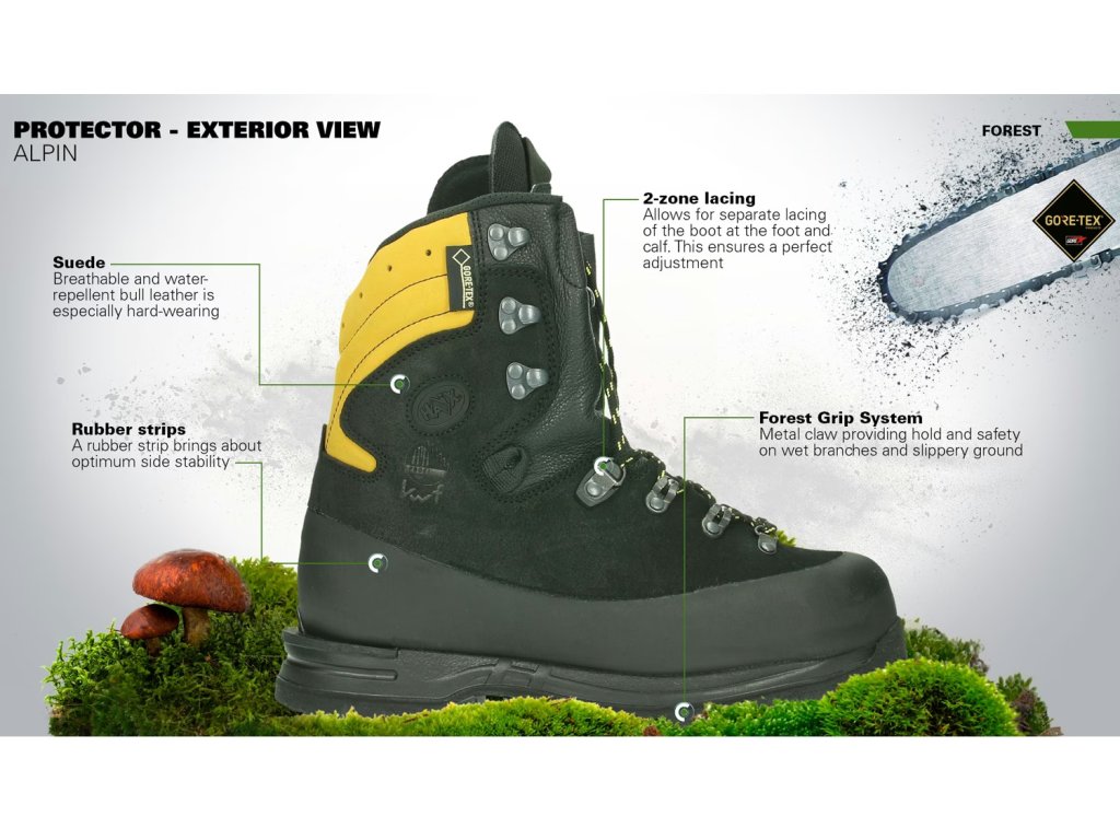 Protipořezové boty HAIX Protector Alpin s dvouzónovým šněrováním mají robustní konstrukci antistatické podrážky s použitým HAIX-FG systémem pro perfektní přilnavost na mokré kmeny stromů. Ochrannou špičku. Dvojitý jazyk pro optimální rozložení tlaku a přizpůsobení noze. Suchý zip na spodním a horním konci jazyka umožňuje individuální úpravu.