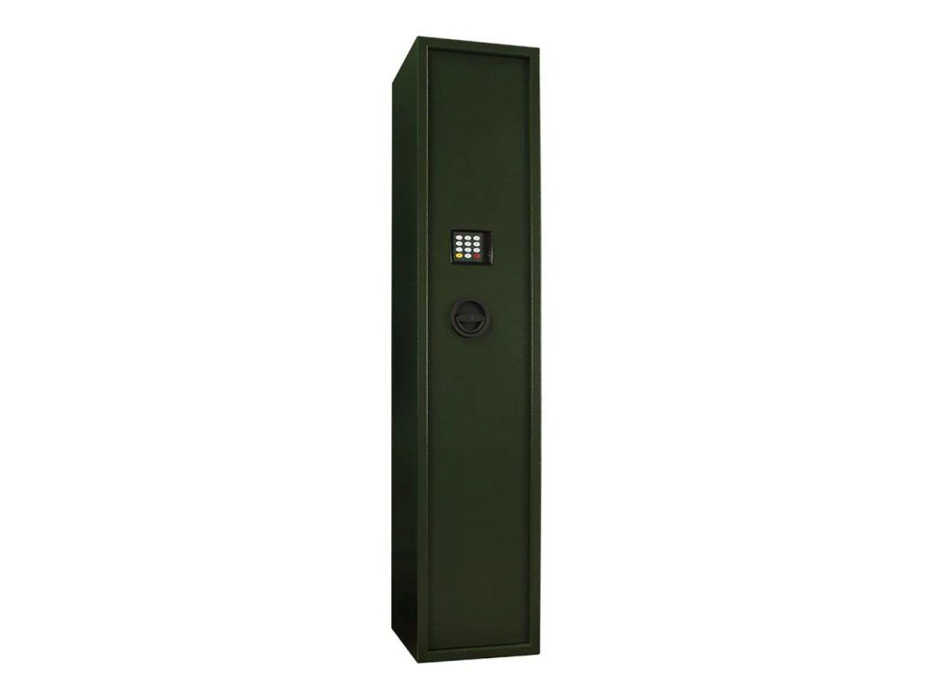 Zelená skříň na zbraně se spolehlivým elektronickým zámkem a 2 nouzovými klíči pro otevření v případě vybití baterií. Jinak je zámek napájen 1,5V AA bateriemi a uvnitř je dostatek prostoru pro 5 dlouhých zbraní. Skříň je vyrobena z kvalitního ocelového plechu tloušťky 3 mm a na vnitřní straně dveří najdete praktický držák, do kterého můžete uschovat nářadí na čištění zbraní. V horní části se nachází samostatně uzamykatelná vnitřní schránka např. pro munici. Skříň na zbraně upevníte na podlahu nebo o zeď přes předpřipravené otvory pro upevnění. Kotvící materiál je součástí dodávky.