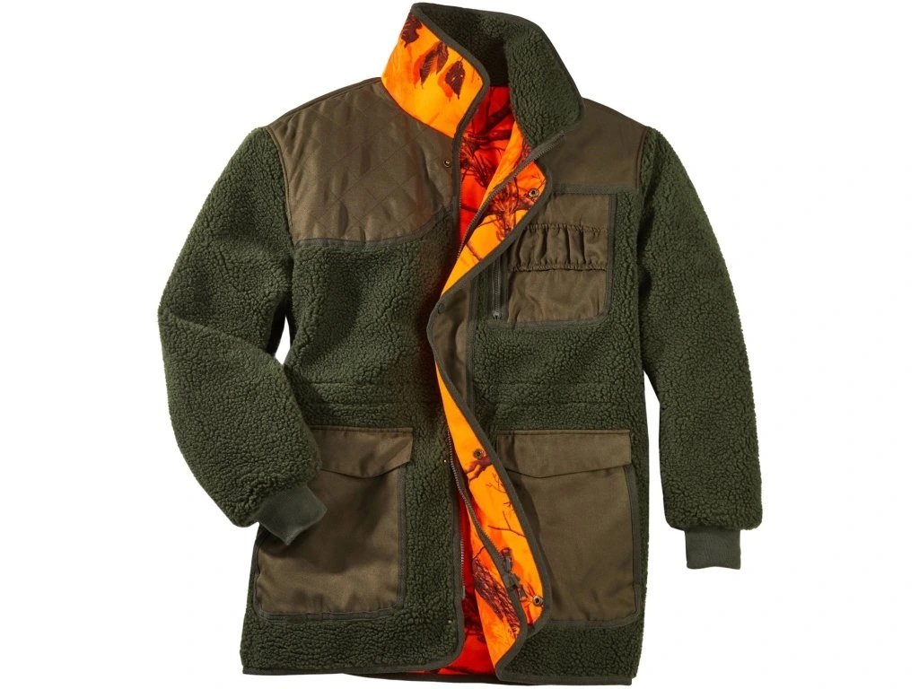 Oboustranná lovecká zimní bunda, se spodní stranou s unikátním vzorem REALTREE, je trhákem na německém trhu. Ramena a kapsy zesíleny pevnou, opotřebení odolnou látkou, nehlučný, vlhku a vodě odolný materiál.