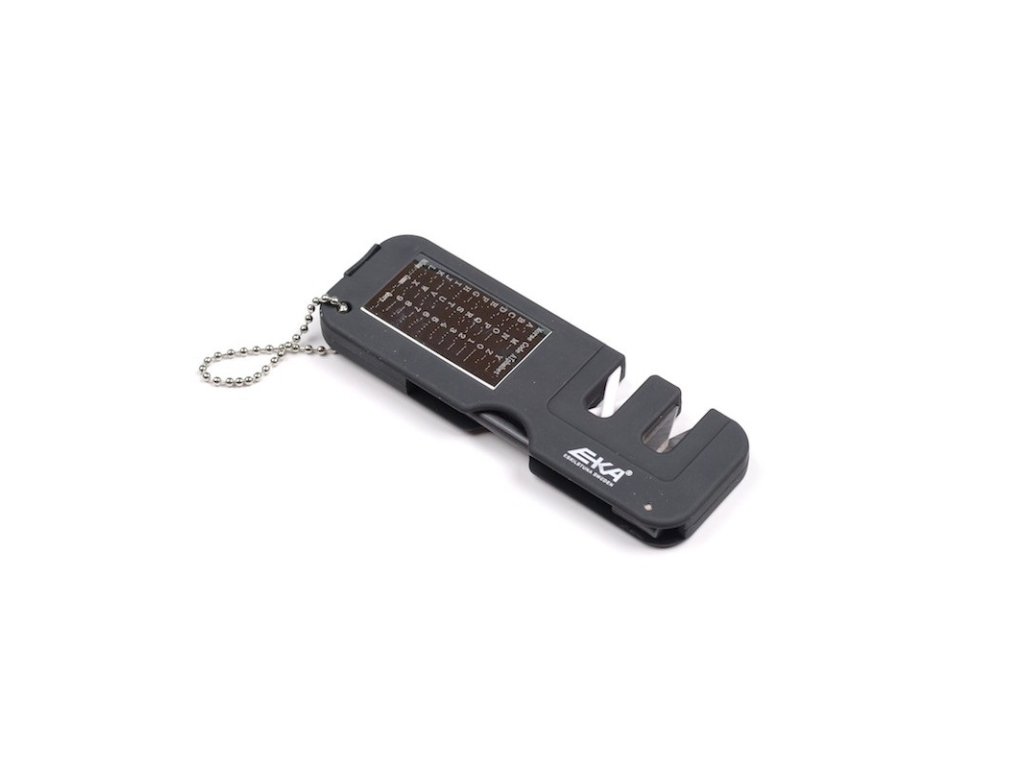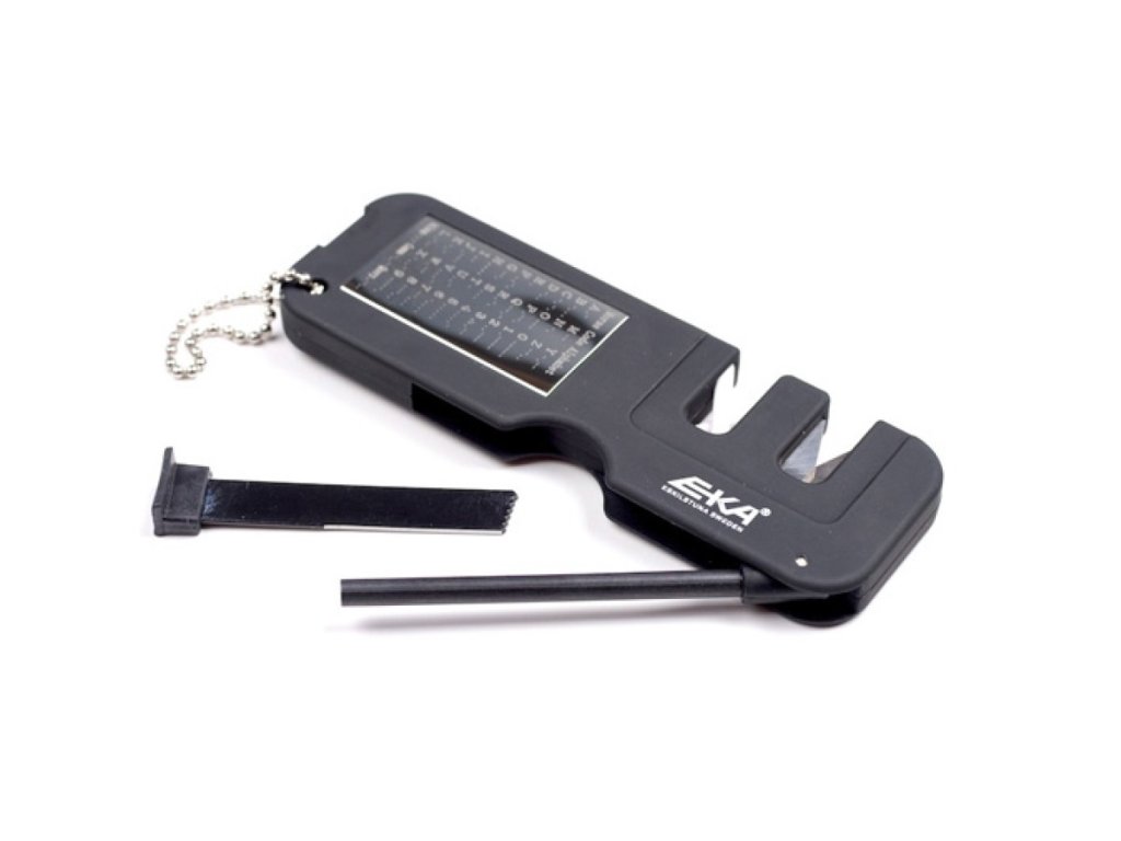 Univerzální švédský ostřič nožů značky Eka, který je navíc vybaven křesadlem a škrtátkem. Je novinkou, kterou jistě ocení lovci, rybáři i kempaři pro naostření nože či rozdělání ohně. Nejprve nůž nabrousíme v karbinových pásech, a poté vybrousíme do požadované ostrosti ve zkřížených keramických pásech. Křesadlo je velmi účinné v jakémkoli podnebí i nadmořské výšce.