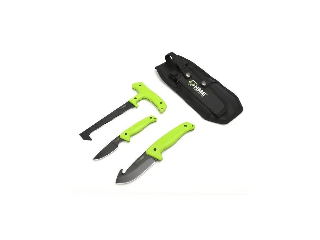 Tato třídílná sada obsahuje téměř vše, co je třeba pro zpracování zvěřiny: ruční pilku na kosti, větší nůž s párákem a menší nůž na jemné práce. Všechny nástroje jsou vyrobeny z pevné a odolné oceli 420HC a jsou opatřeny protiskluzovou TPE rukojetí.