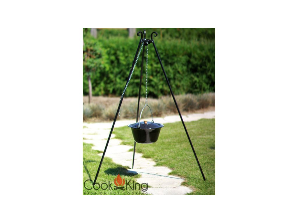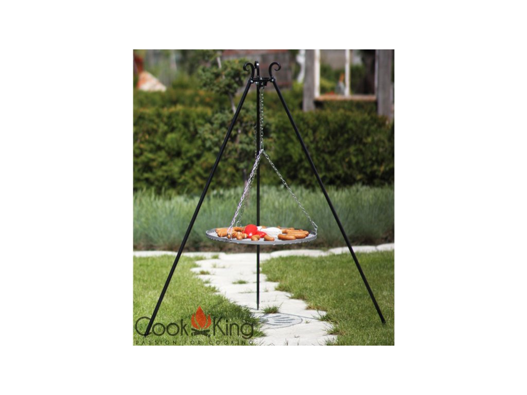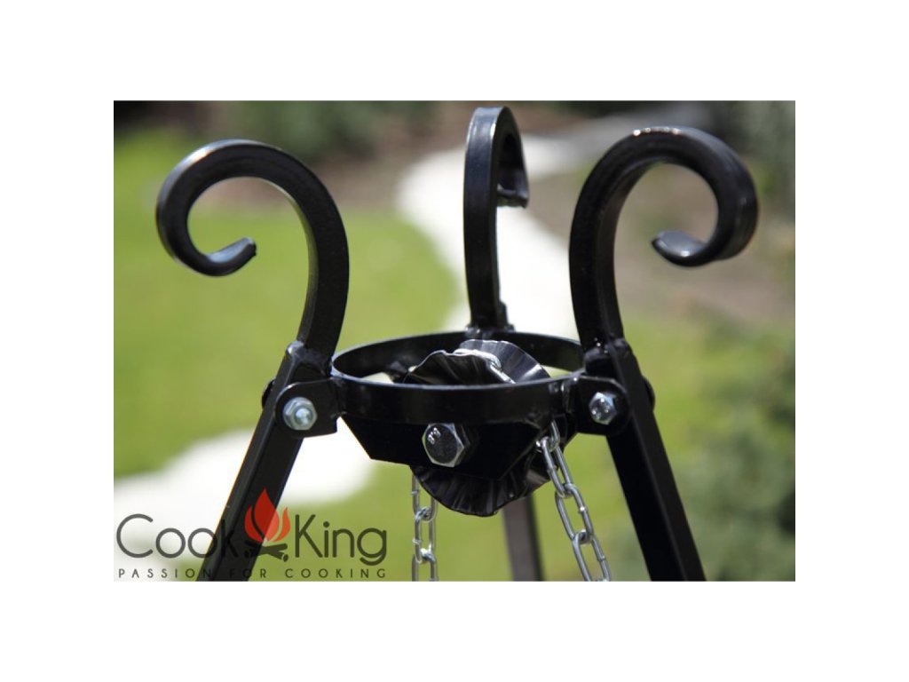 Stabilní trojnožka ke kotlíku nebo roštu pro vaření či grilování na otevřeném ohni umožňuje grilovat na jakémkoli povrchu, dokonce i nerovném. Trojnožka je opatřena práškovou barvou pro větší odolnost proti mechanickému poškození a povětrnostním vlivům. Výšku kotlíku nebo grilovacího roštu lze snadno upravit pomocí řetízku, kladky umístěné v horní části trojnožky a háčků.