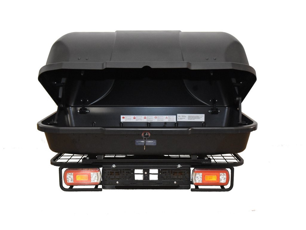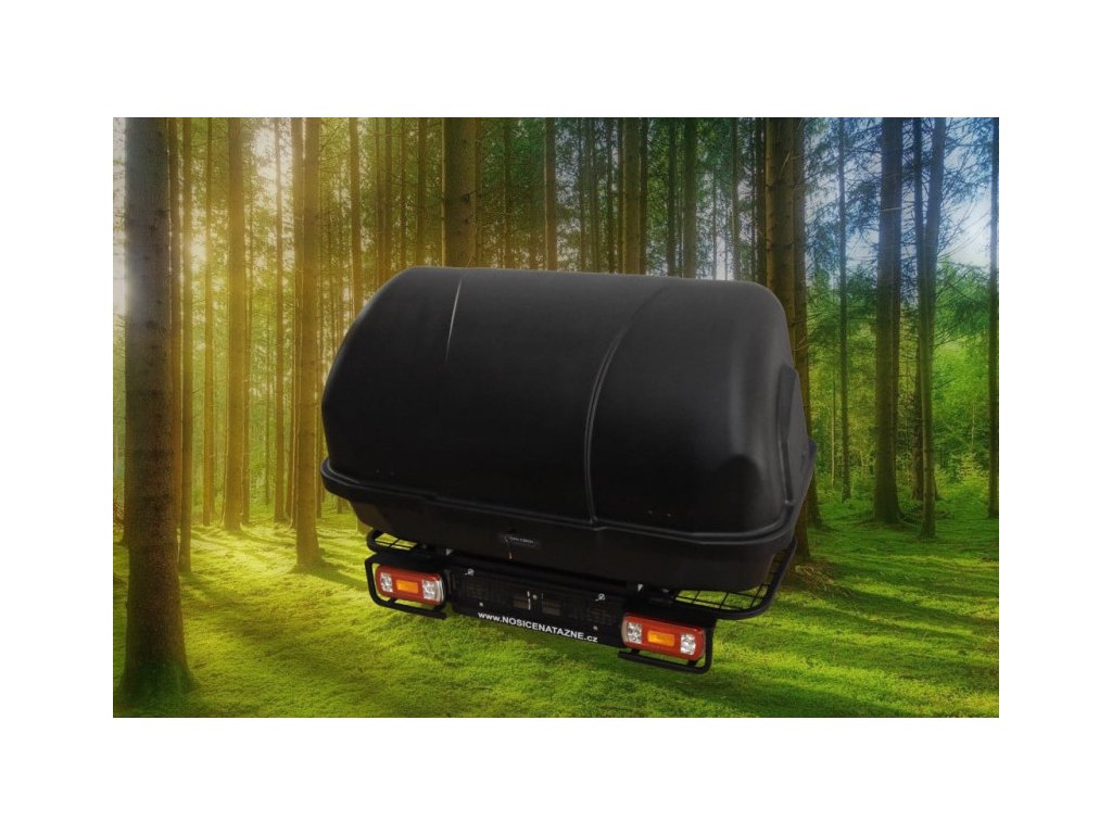 Univerzální nosič na tažné zařízení, opatřený spolehlivým sklopným systémem na šroub vč. zámku a na něj integrovaný 400l přepravní box.