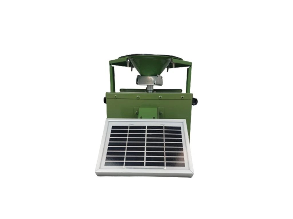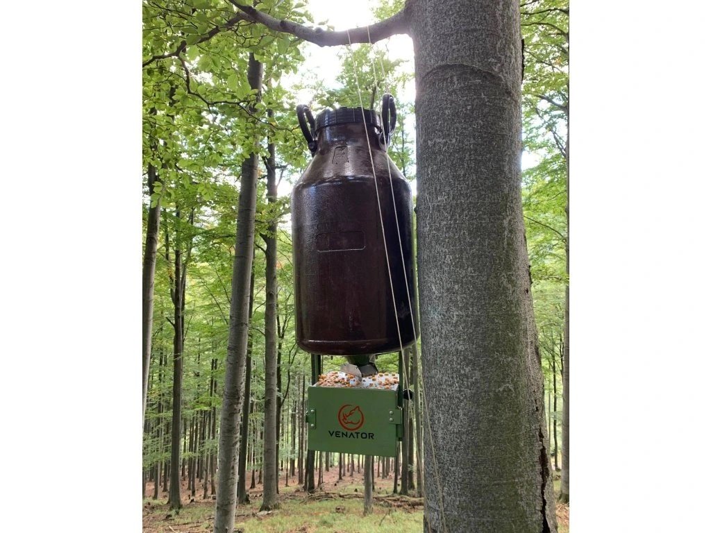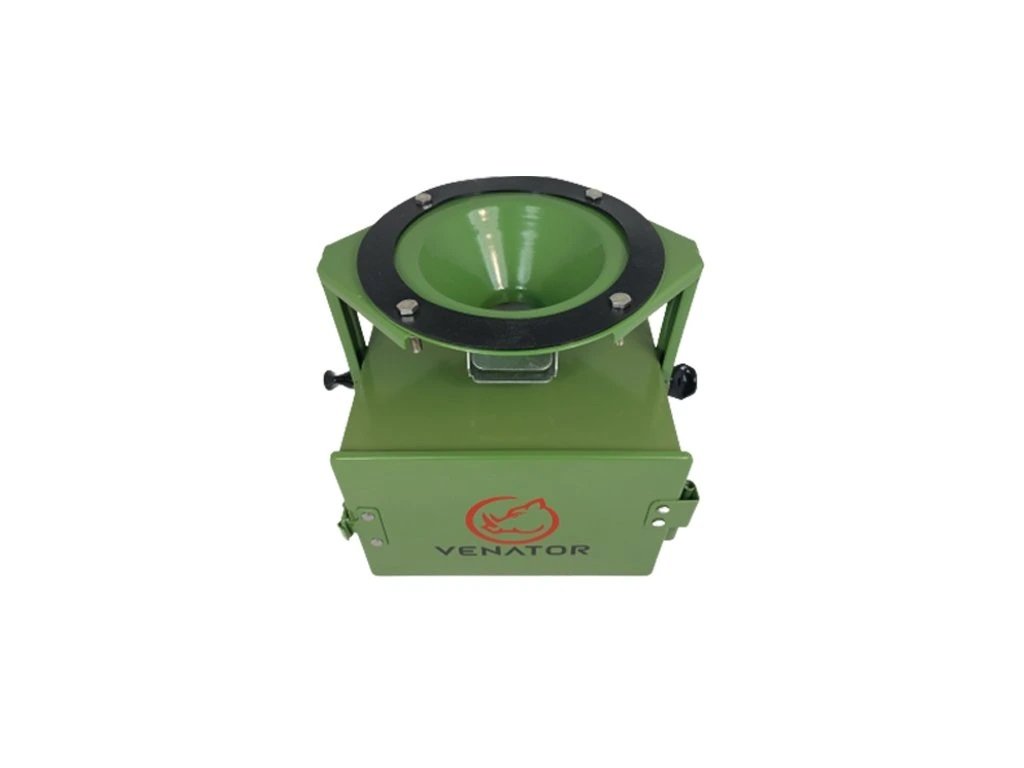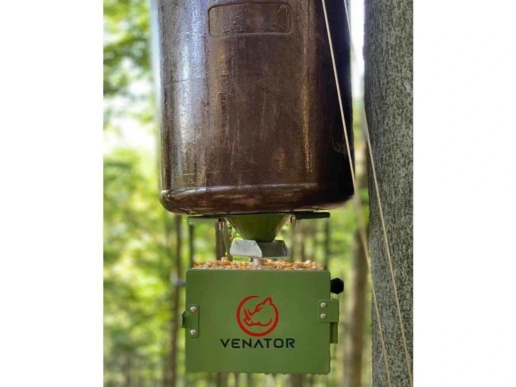 Kovový krmný automat Feed22S značky Venator s nastavitelným časováním a přídavným solárním panelem. Konstruovaný pro rozmetání krmiva v 360°.