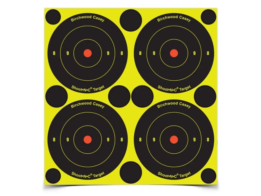 Vrstvený samolepící terč BIRCHWOOD CASEY SHOOT•N•C BULL’S-EYE TARGET 3" s barevnou signalizací zásahu a záslepkami v rozích. Balení 12ti archů (48 terčů ⌀7,5 cm+ 120 záslepek).